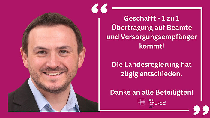 „Wir freuen uns sehr, dass die Landesregierung sehr zügig uns diese Zusage gemacht hat. Viele Kolleginnen und Kollegen warten seit der Verkündung der Ergebnisse aus dem TV-L auf diese Nachricht. Somit ist es uns wiederholt gelungen, in schwierigen Zeiten auch die finanzielle Verbesserung auf die verbeamteten Kolleginnen und Kollegen zu übertragen. Als dbb ist es uns wichtig, dass niemand weiter im öffentlichen Dienst abgehängt wird und dies ist somit gelungen. Wir danken den Verantwortlichen für die rasche Zusage und erwarten nun die konkrete Umsetzung.“